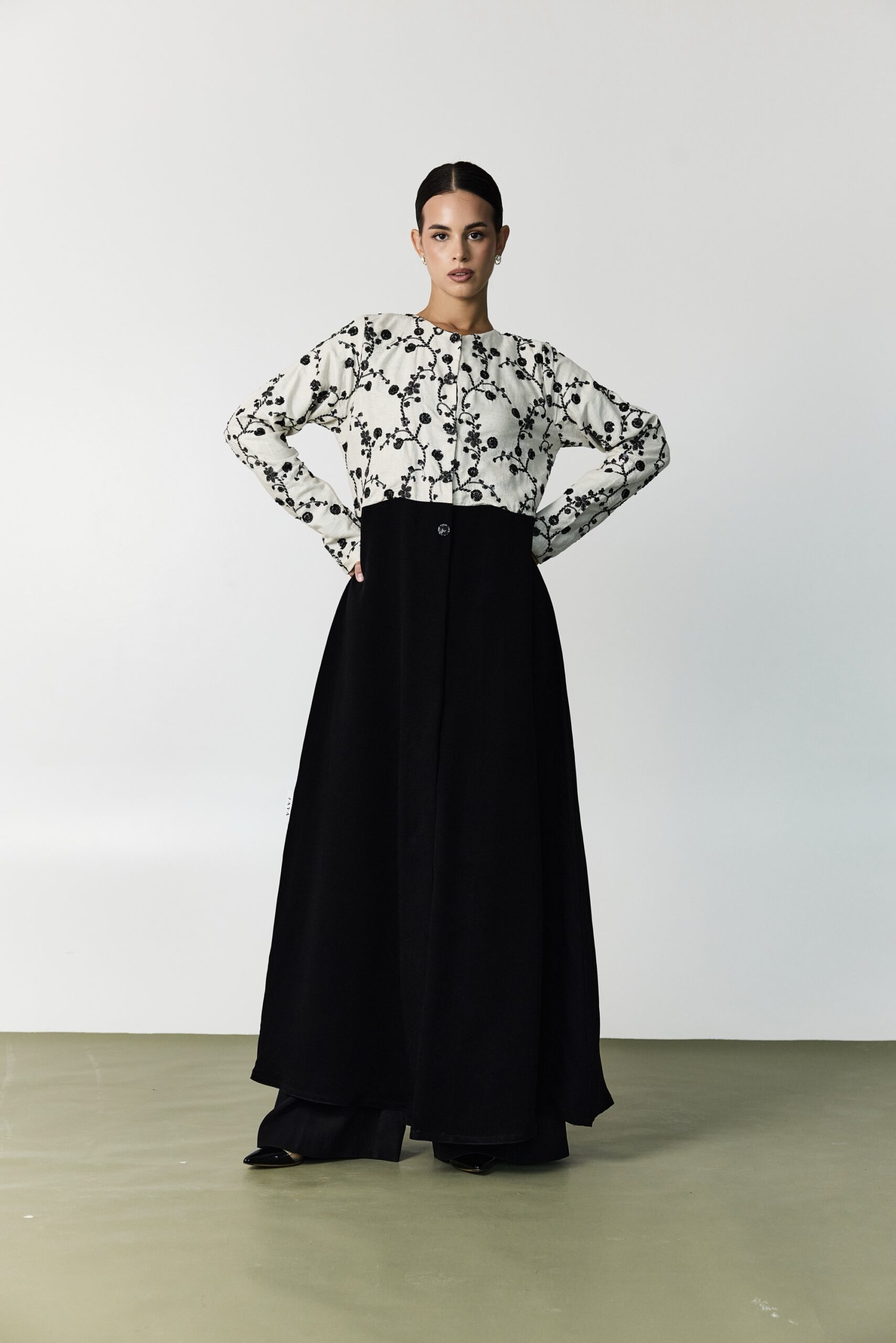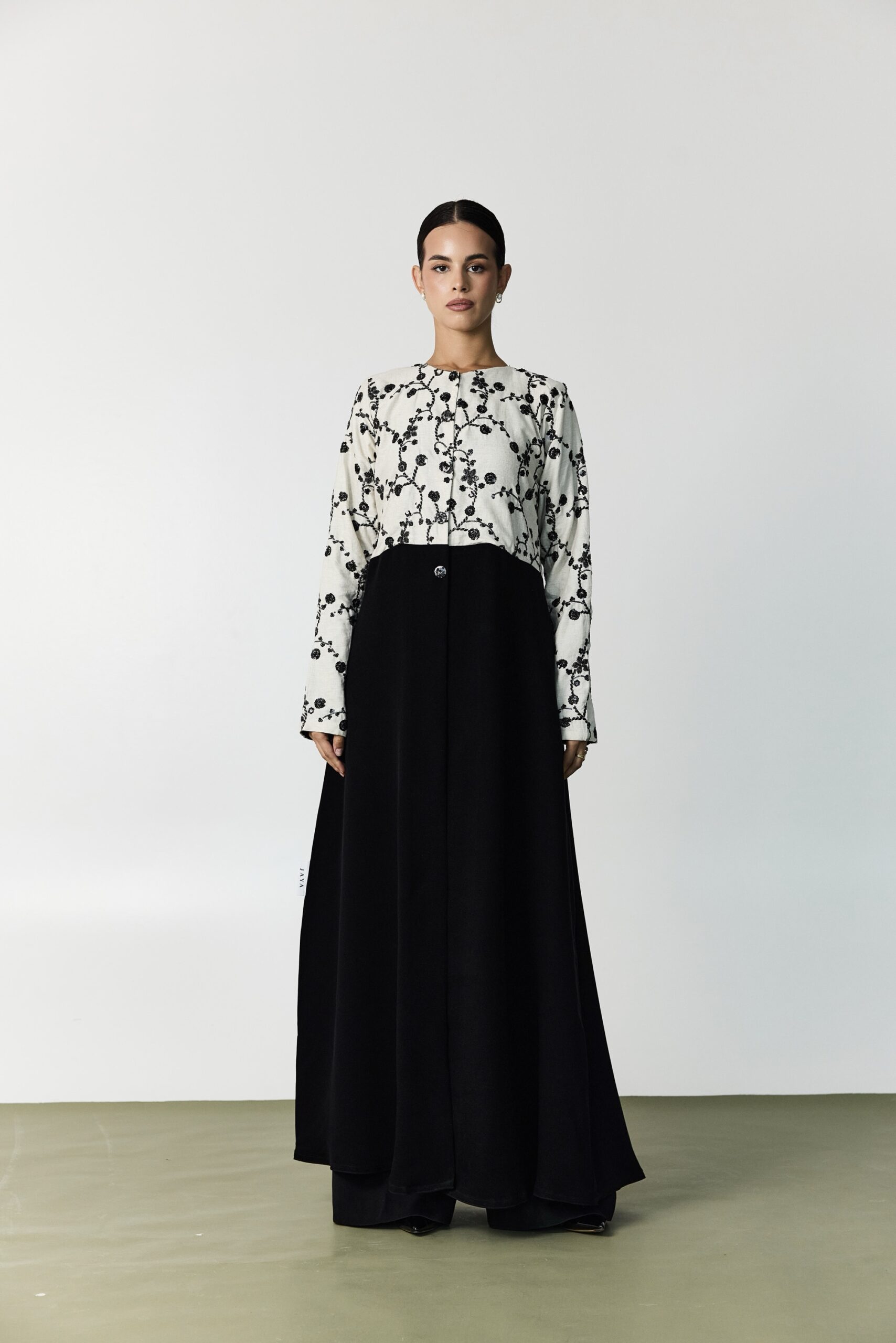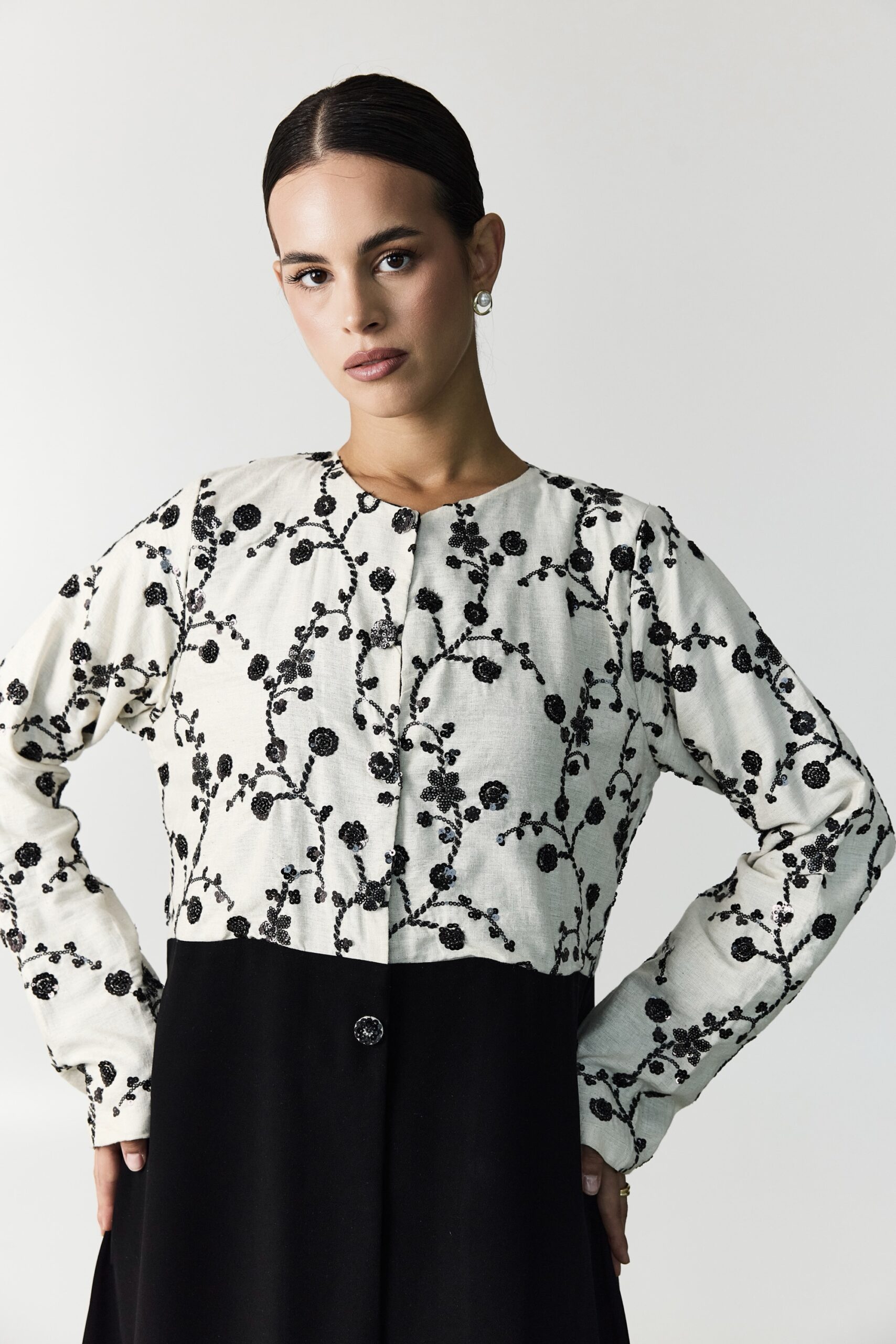 half-up linen abaya in a grey-beige tone, detailed with black sequins running along the length, paired with black crepe