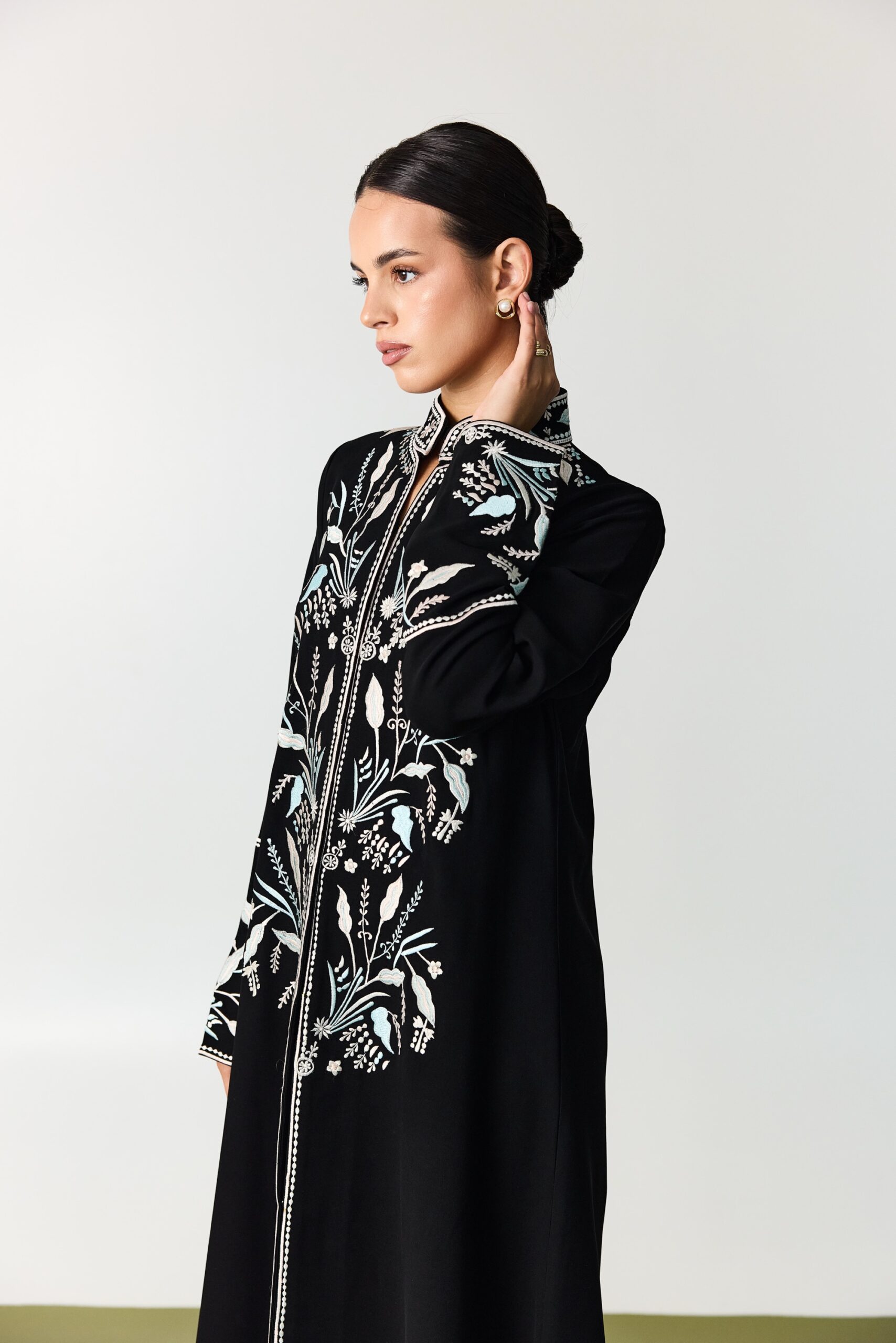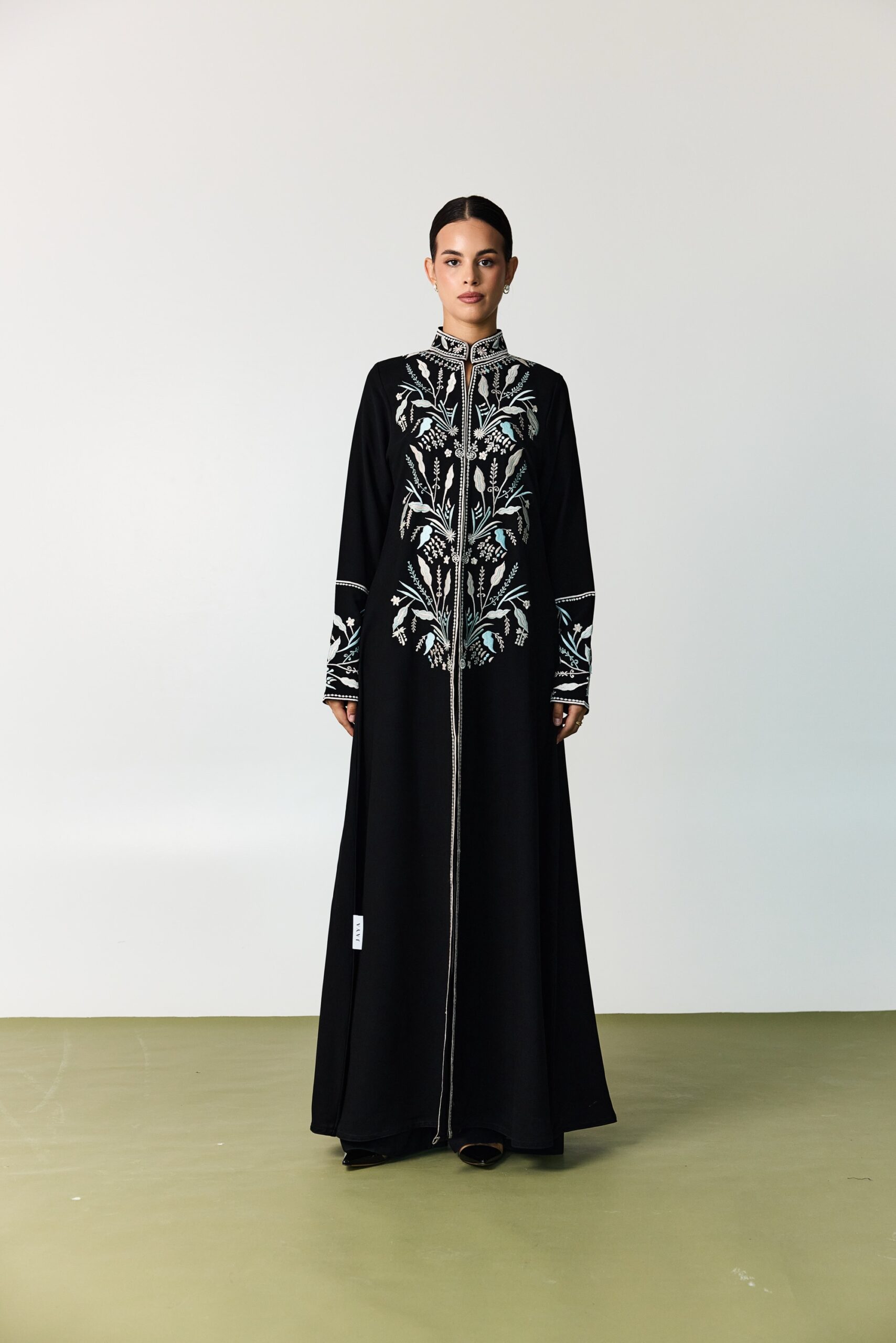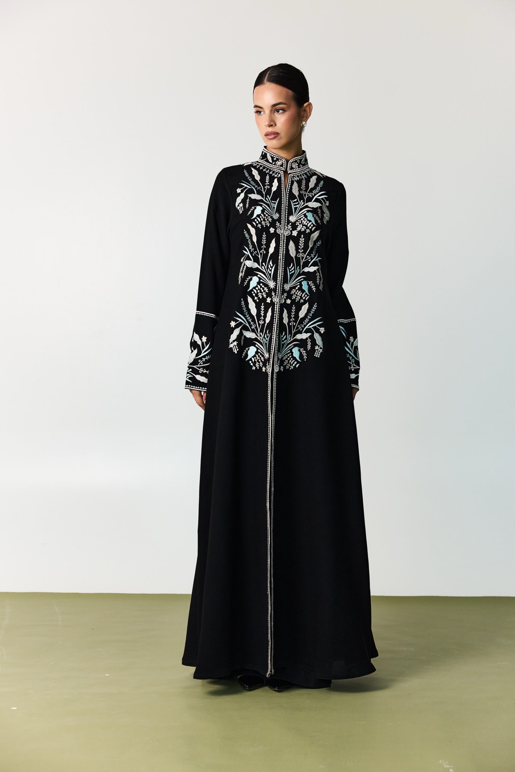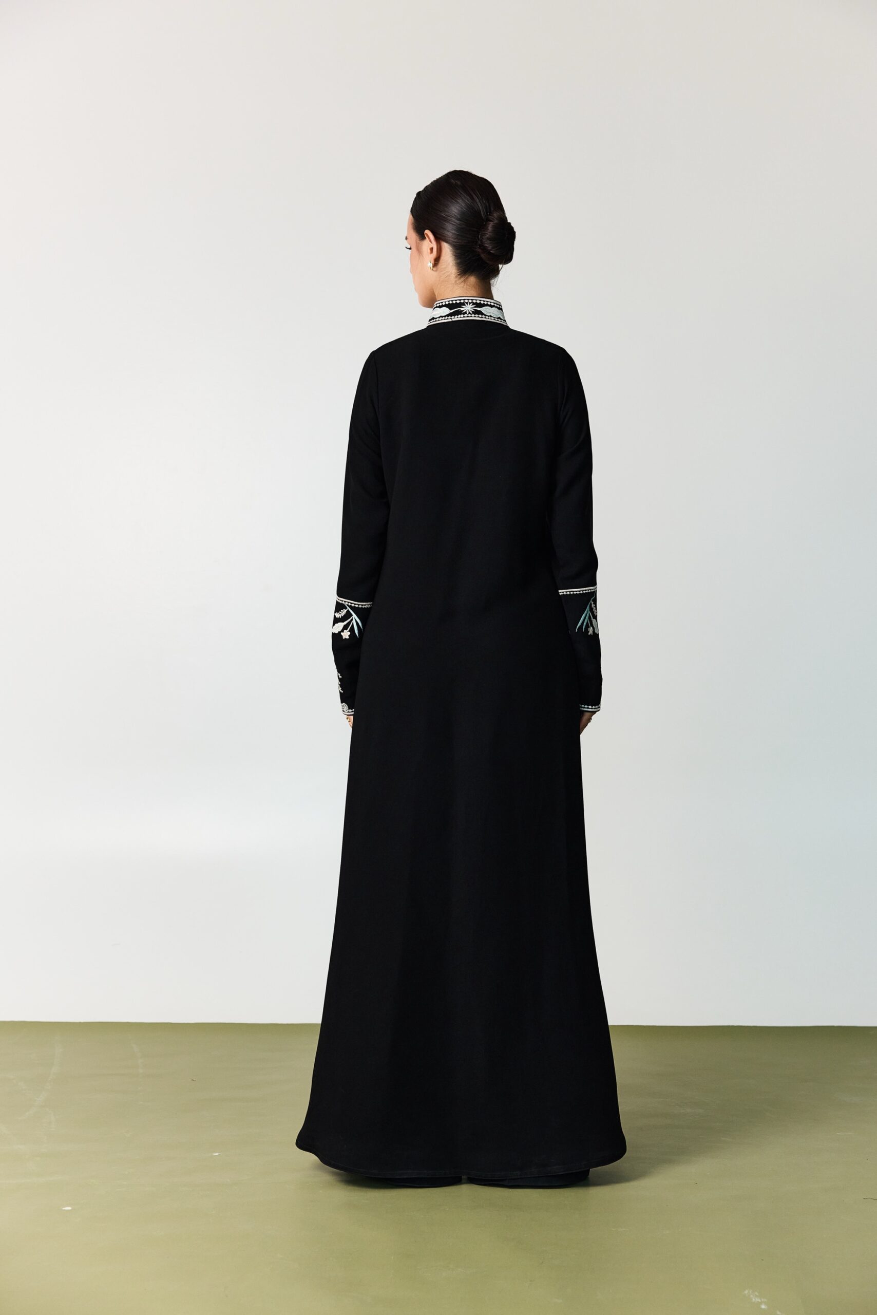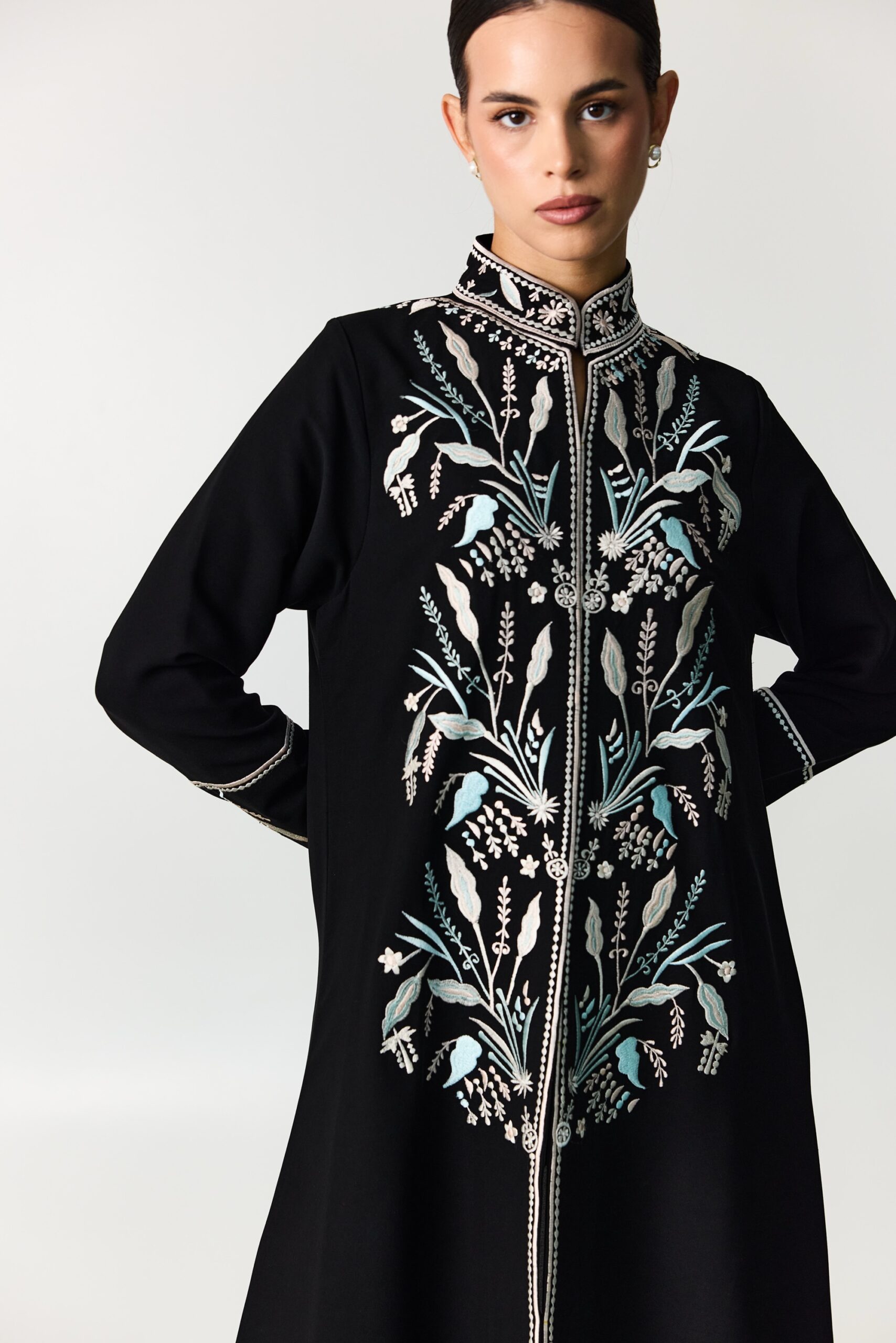 black crepe abaya featuring delicate floral embroidery in soft pastel shades of light pink and sky blue