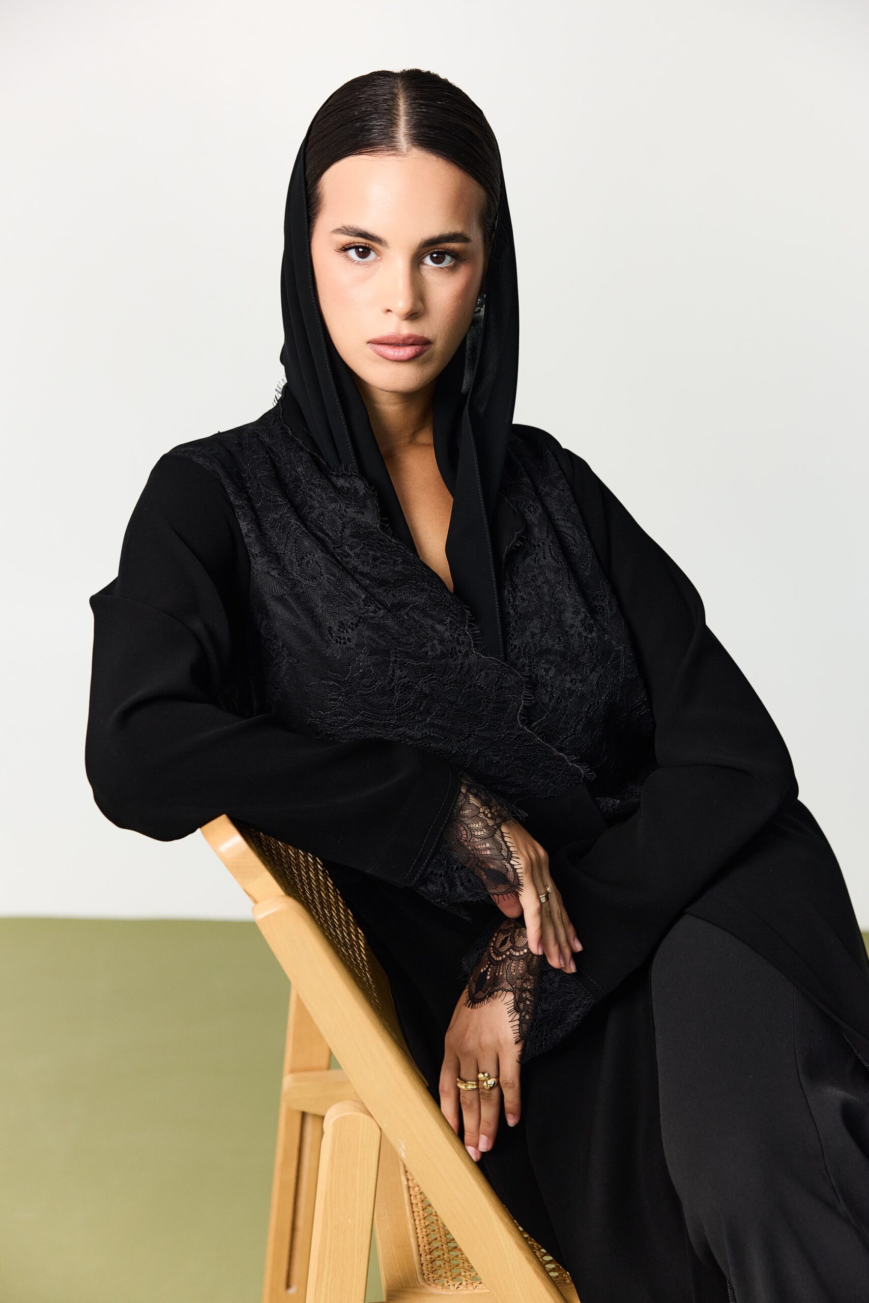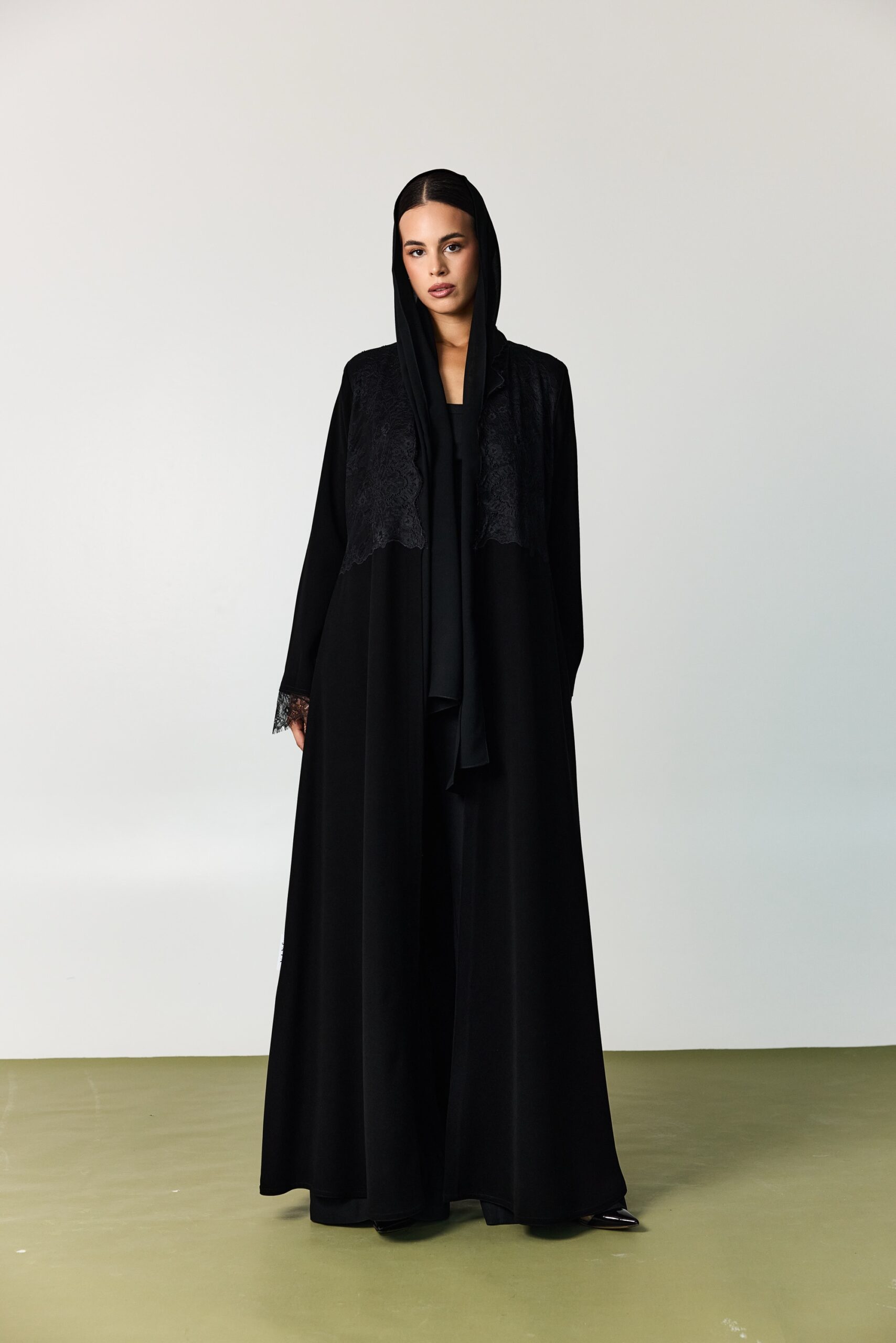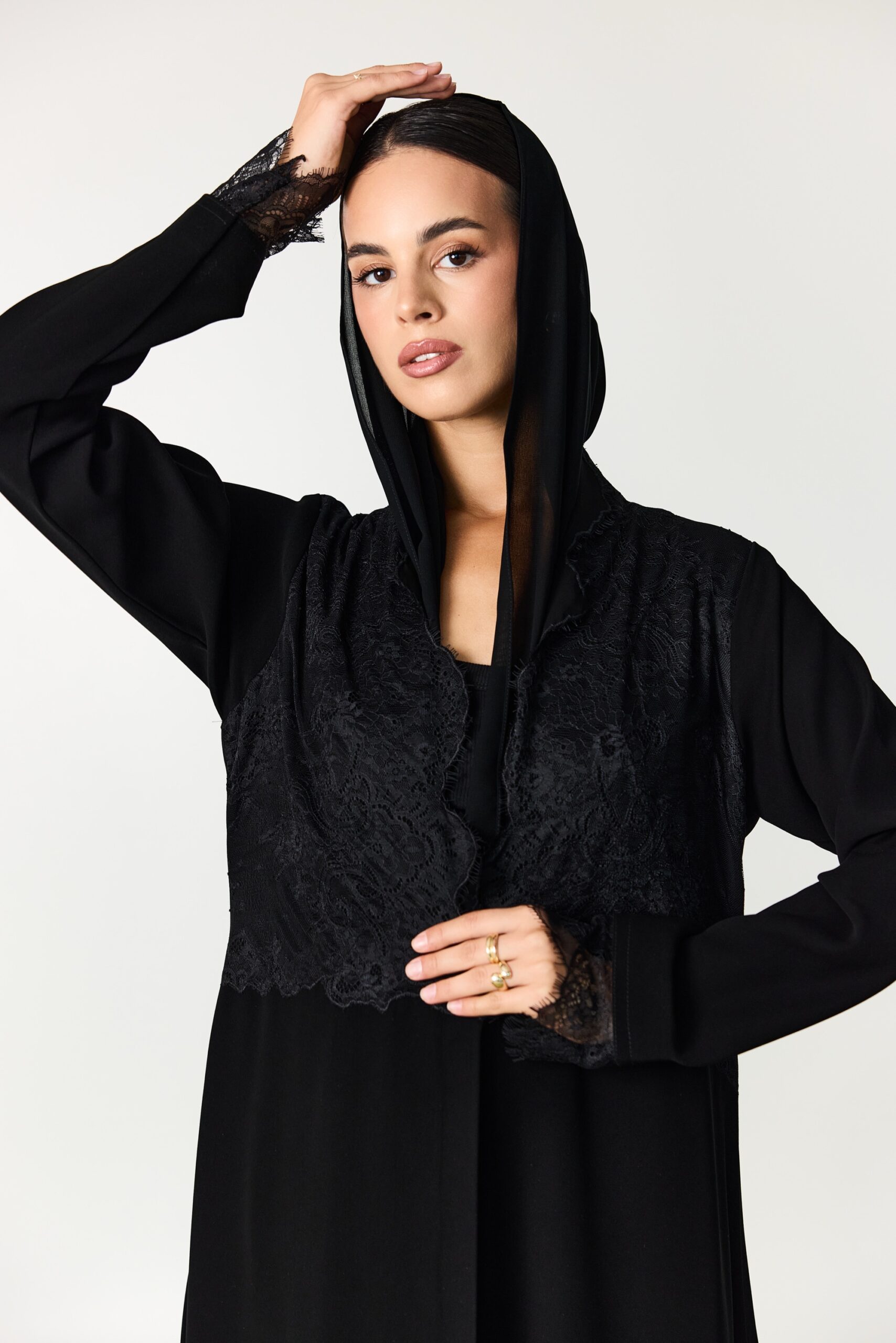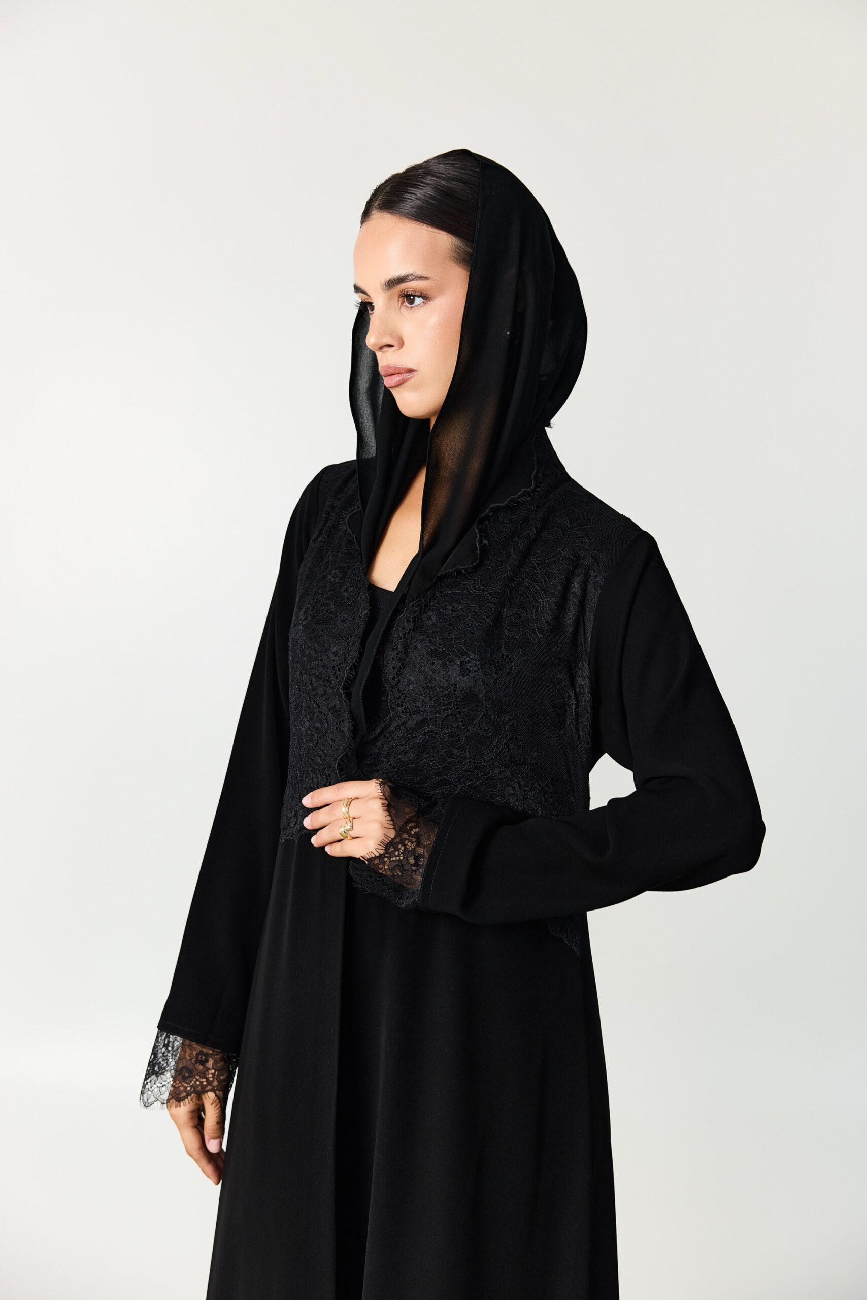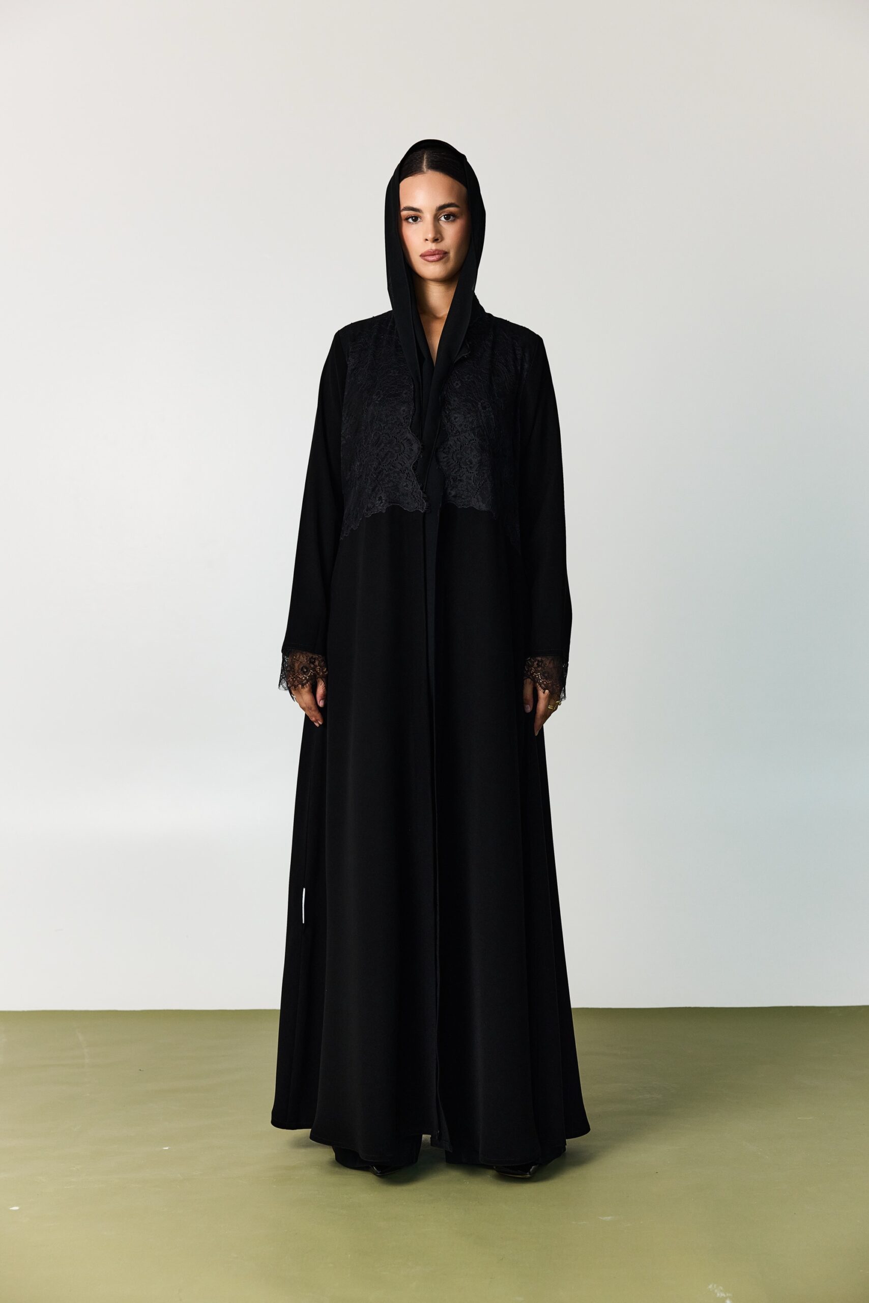 black crepe abaya with delicate lace detailing on the half front and at the sleeve cuffs