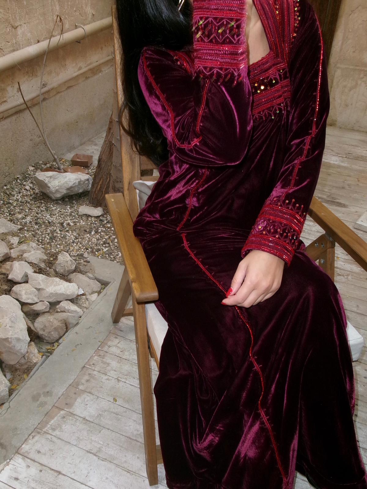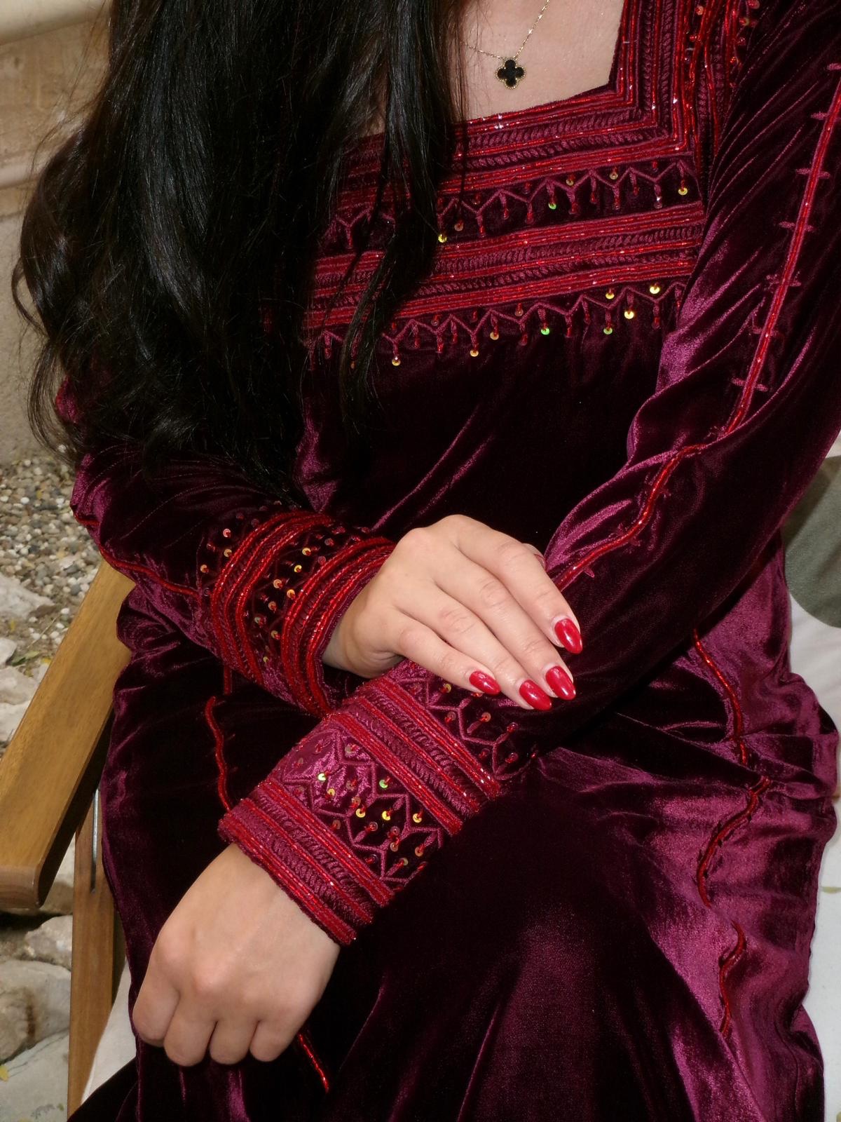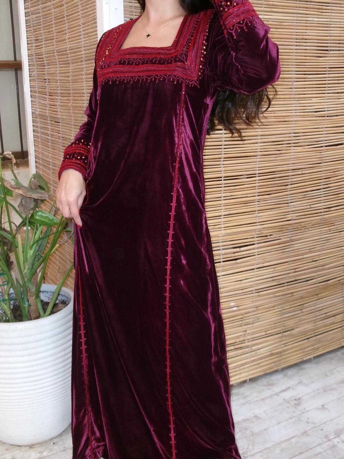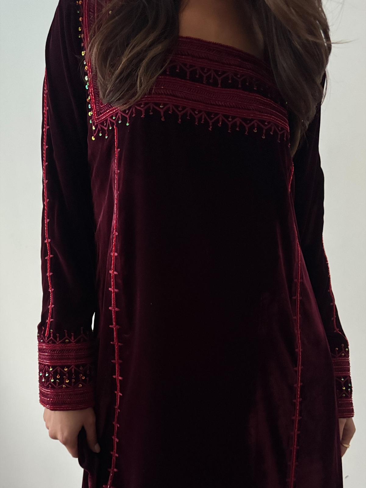 Deep burgundy velvet jalabiya detailed with rich tonal embroidery and delicate bead accents