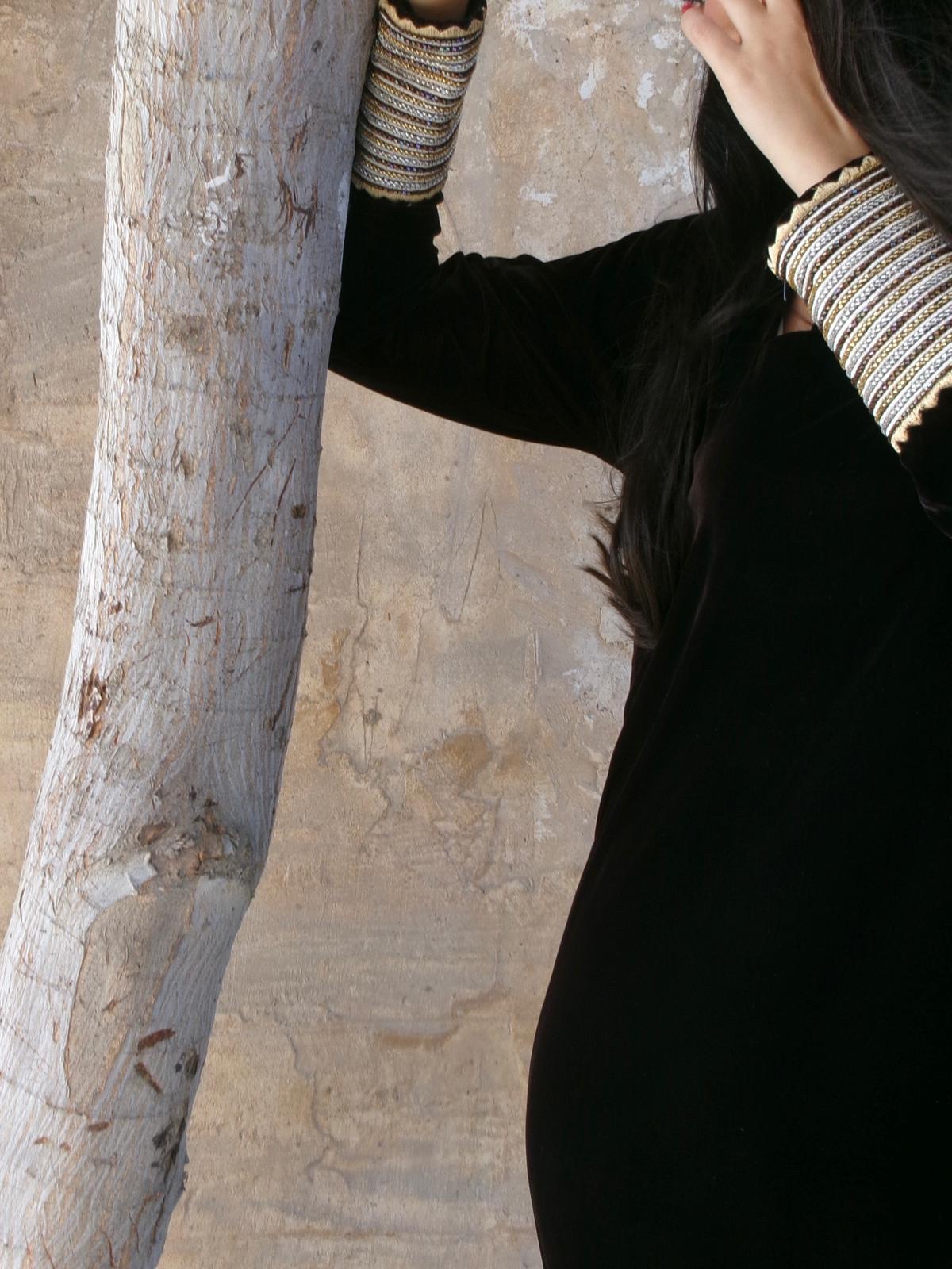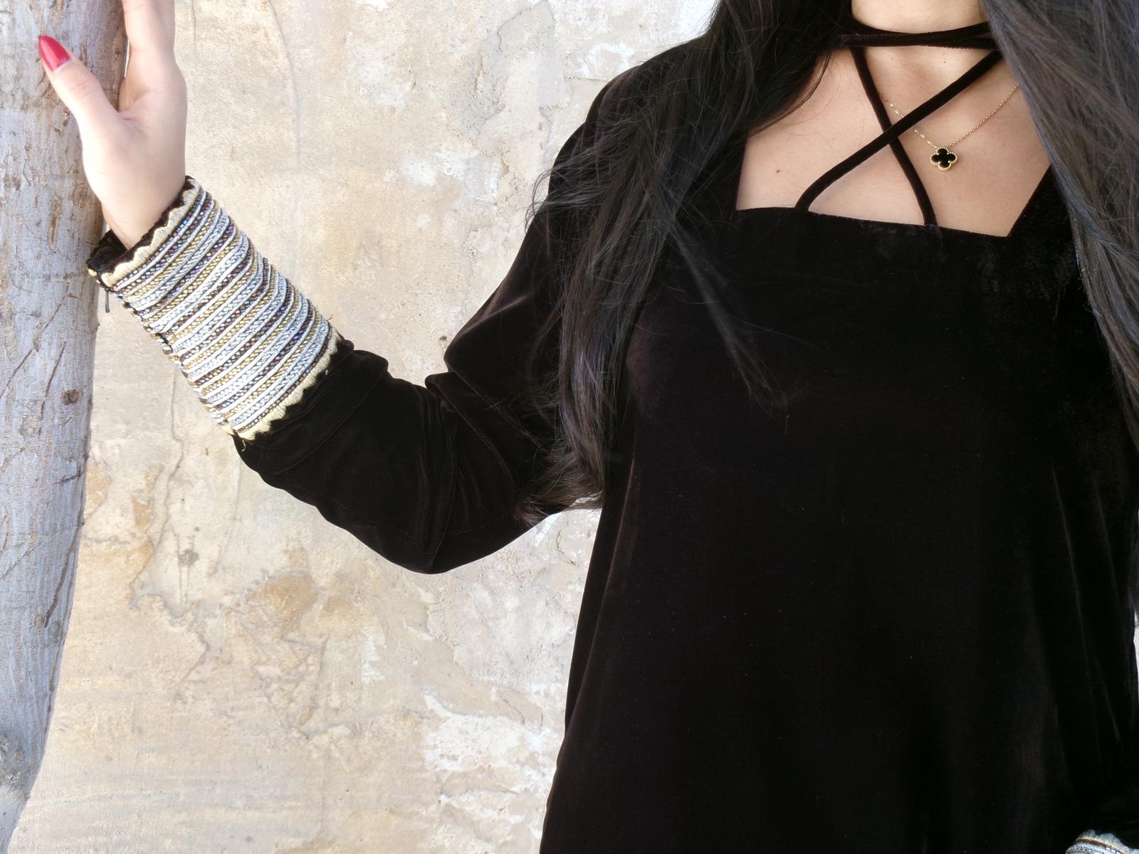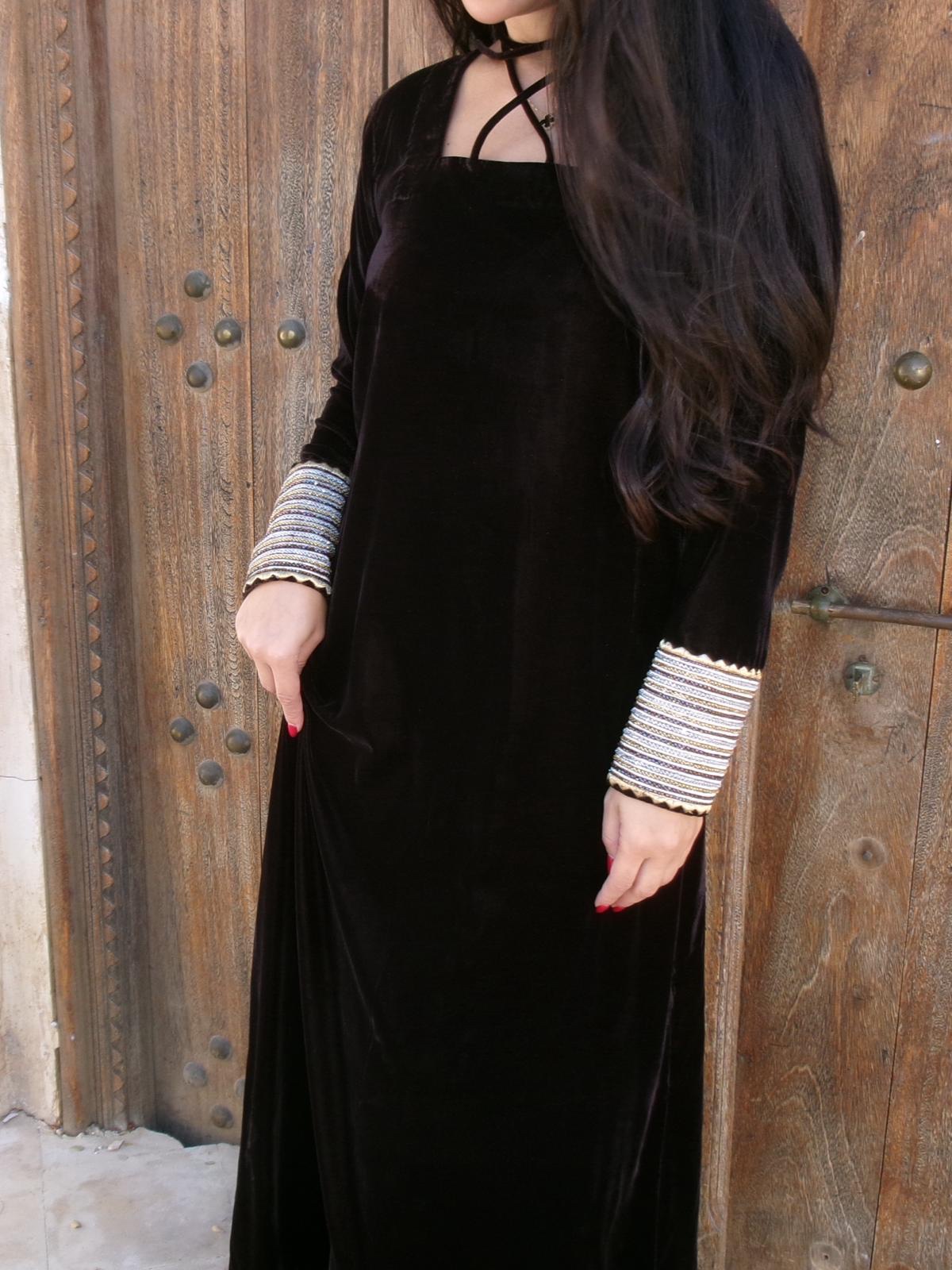 Brown velvet jalabiya with traditional cuff detailing