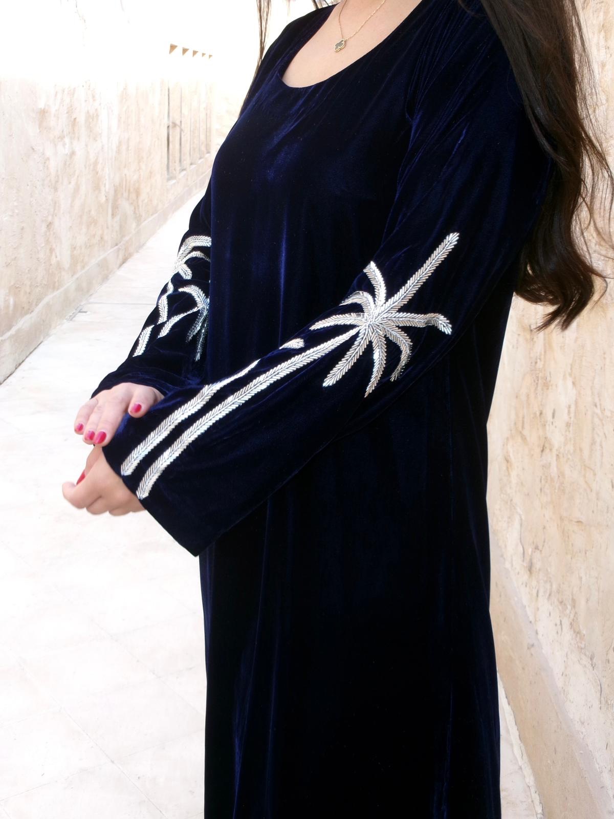 Navy velvet jalabiya adorned with silver palm inspired embroidery on the sleeves, finished with subtle side slits for a graceful, flowing silhouette